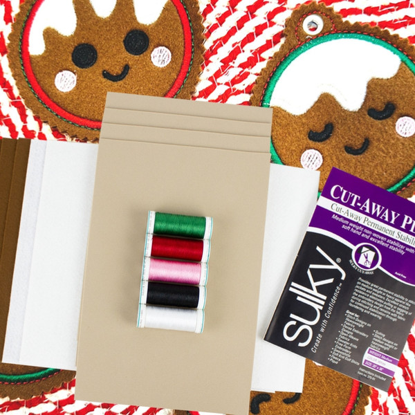 Learn how to create a set of adorable Gingerbread Ornaments in the hoop of your embroidery machine! These ornaments also do double-duty as personalized gift tags, a garland, or a wreath to add to your holiday décor. They come together quickly and easily using Sulky Felty for texture and Sulky Puffy Foam for dimension. Included are enough materials to make two sets of four ornaments!