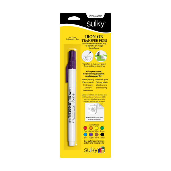 This 4 pack value-priced assortment of Sulky Iron-On Transfer pens come in a unique, re-closable "screw top" clear tube that provides a nice storage container. You can get the most popular colors in this value pack collection. All skill levels will enjoy using Sulky Iron-On Transfer pens to easily transfer designs onto fabric, canvas, wood, stabilizers, or just about any surface where a hot iron can be used. Make a permanent, non-bleeding transfer. Just trace, draw and then iron. Ink glides on like a marker. Transfer 3-5 times with one application. Made in the USA! Easy to follow instructions. Package contains one of each: black, blue, brown and red. The nib is 2 mm.
