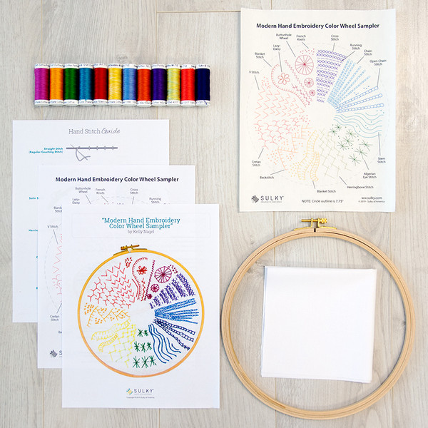 A fantastic Hand Embroidery Kit for Beginners! Our Modern Hand Embroidery Rainbow Color Wheel Sampler is a great introduction stitch sampler, as well as a nice refresher for more seasoned stitchers. This hand embroidery sampler kit contains everything you need to get started and more, including 12 spools of Sulky 12 wt. Cotton Petites Thread, a hoop, the design pre-printed on a sheet of Stick 'n Stitch, and more! The best part? When you're finished, it's cute enough to hang in your sewing studio as a reference tool!