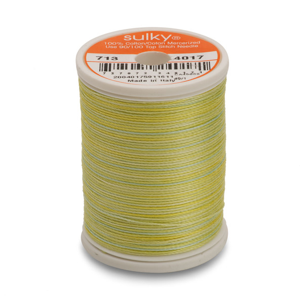 Our 300 yard spool is the perfect size for your most loved colors and when you don't want to run out in the middle of your masterpiece! These exciting, multicolor threads are a masterful blend of different colors within the same range of tone and intensity, with random, subtle color changes every 2-1/2 to 5 inches! No other thread does this! Make a beautiful, bolder statement on your quilting, serging, embroidery, handwork and other decorative projects with Sulky 12 Wt. Cotton Thread. It is 40% thicker than 30 wt. Cotton. All Sulky Cotton Threads are premier quality, long staple, highly mercerized Egyptian cotton with a matte finish to create a soft, warm, natural look and feel. ALL our cotton thread comes from 100% Egyptian Cotton that is grown in Egypt. Most critical to its quality is that it is dyed and finished in Italy, which is why you see Made in Italy on the spool.