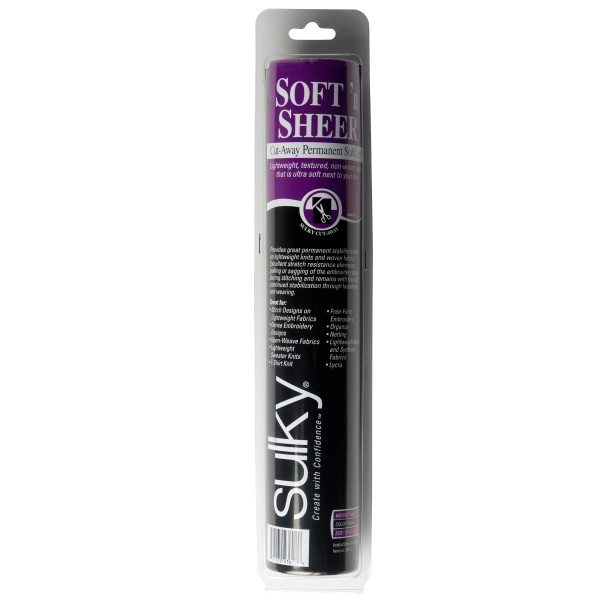 Sulky Soft n Sheer stabilizer is an acid free permanent, lightweight, textured, non-woven nylon that has excellent stretch resistance and is ultra-soft next to your skin. It provides great permanent stability to stitch on lightweight knits and woven fabrics. Excellent stretch resistance eliminates puling or sagging for the embroidery design during stitching and remains with fabric for continued stabilization through laundering and wearing. Easy removal once stitching is completed, remove from hoop and cut away the stabilizer up to the outer edge. Packaged in a re-useable clamshell storage container to keep your stabilizer fresh and usable for years. All Sulky stabilizers are acid and lead free!