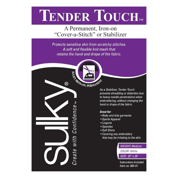 Sulky Tender Touch stabilizer is a permanent lightweight, iron-on stabilizer that protects sensitive skin from scratchy stitches by fusing it onto the back of embroidered garments. As a soft and flexible knit mesh it retains the hand and drape of the fabric when used as an interfacing or in fabric manipulation. It is Ideal as an iron-on lining in garment construction. Our packaged size stabilizers are great for trying out or for smaller projects. All Sulky stabilizers are acid and lead free!