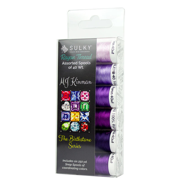Each thread pack represents one precious gem from MJ Kinman's Birthstone Series. The thread colors coordinate perfectly with the fabric bundles curated for MJ's individual patterns. Purchase the thread packs separately or the complete thread collection to make a full quilt representing all 12 birthstones for each month of the year.